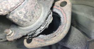 Na poniższych zdjęciach możesz zobaczyć, co było głównym powodem głośniejszej pracy silnika. Miejsce, w którym układ wydechowy powinien pracować, tj. na pierścieniu stożkowym (punkt elastyczny) pojawiła się korozja, która "zjadła" i zlepiła element na stałe.